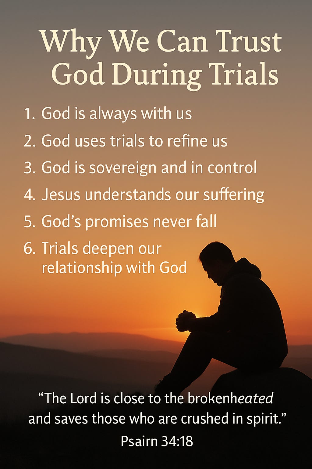 Trusting God during trials doesn’t mean we deny our pain or pretend everything is fine. It means we hold fast to the truth that God is good, He is with us, and He is working all things for our good and His glory. When we choose to trust Him—especially when it's hard—we find peace, strength, and the deep assurance that no trial can separate us from His love.