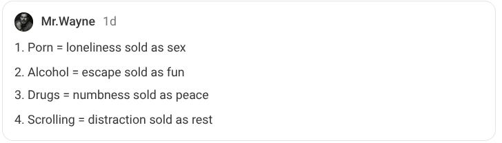 Porn trains your brain to associate comfort, escape, relief, novelty, and control with one easy behavior. There’s no rejection or vulnerability. So It’s easy. Effortless. Just dopamine on demand.